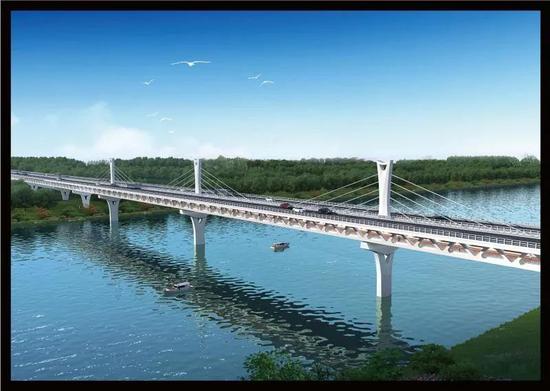 其中桥梁部分长约1378米,其跨江主桥设计采用三塔两跨双层钢桁架矮塔斜拉桥的结构形式,上层车行桥为双向六车道,设计总宽26米,下层为人行通道与非机动车道,宽15米。