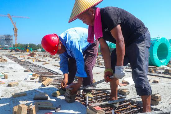 8月17日,在河南省光山县横跨官渡河的龙山大桥施工现场,工人们正冒着高温酷暑抓紧推进施工进度。据悉,龙山大桥是该县重点民生工程,建成后,可连接仙居乡、砖桥镇产业聚集区等六个乡镇及王大湾会议旧址、花山寨等旅游景点,服务贫困村约40多个、贫困人口近2万人。龙山大桥全长517米,宽25米,采用双向四车道设计,预计2020年10月1日建成通车。