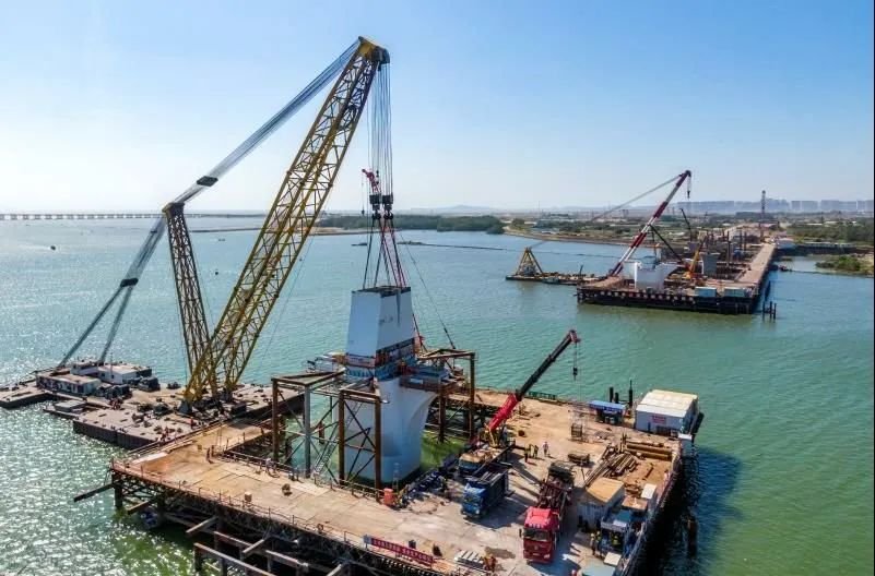 中砂大桥全长1325米,主跨180米,采用双塔单索面斜拉桥设计。其中9#、10#两个主墩下塔柱为混凝土结构,上塔柱为钢结构,高65.2米,呈海豚造型。单个上塔柱分为10个节段,节段总重约1600吨,首节钢塔节段重约262吨,采用大型浮吊一次性安装就位。